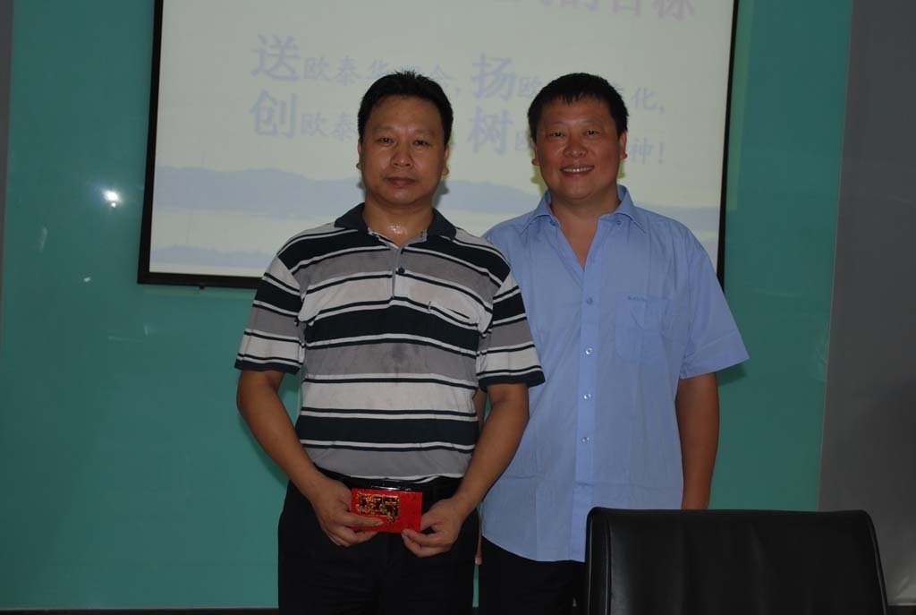 圖為公司副總工程師衛志兵(右一)為皮師傅頒發合理化建議獎
