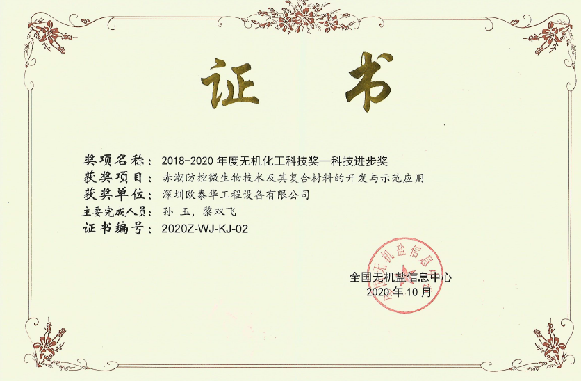 深圳歐泰華工程設備有限公司的“赤潮防控微生物技術及其復合材料的開發與示范應用”新技術,榮獲2018-2020年度全國無機鹽科技進步獎。這標志著歐泰華公司在海水凈化應用領域方面得到全新突破。