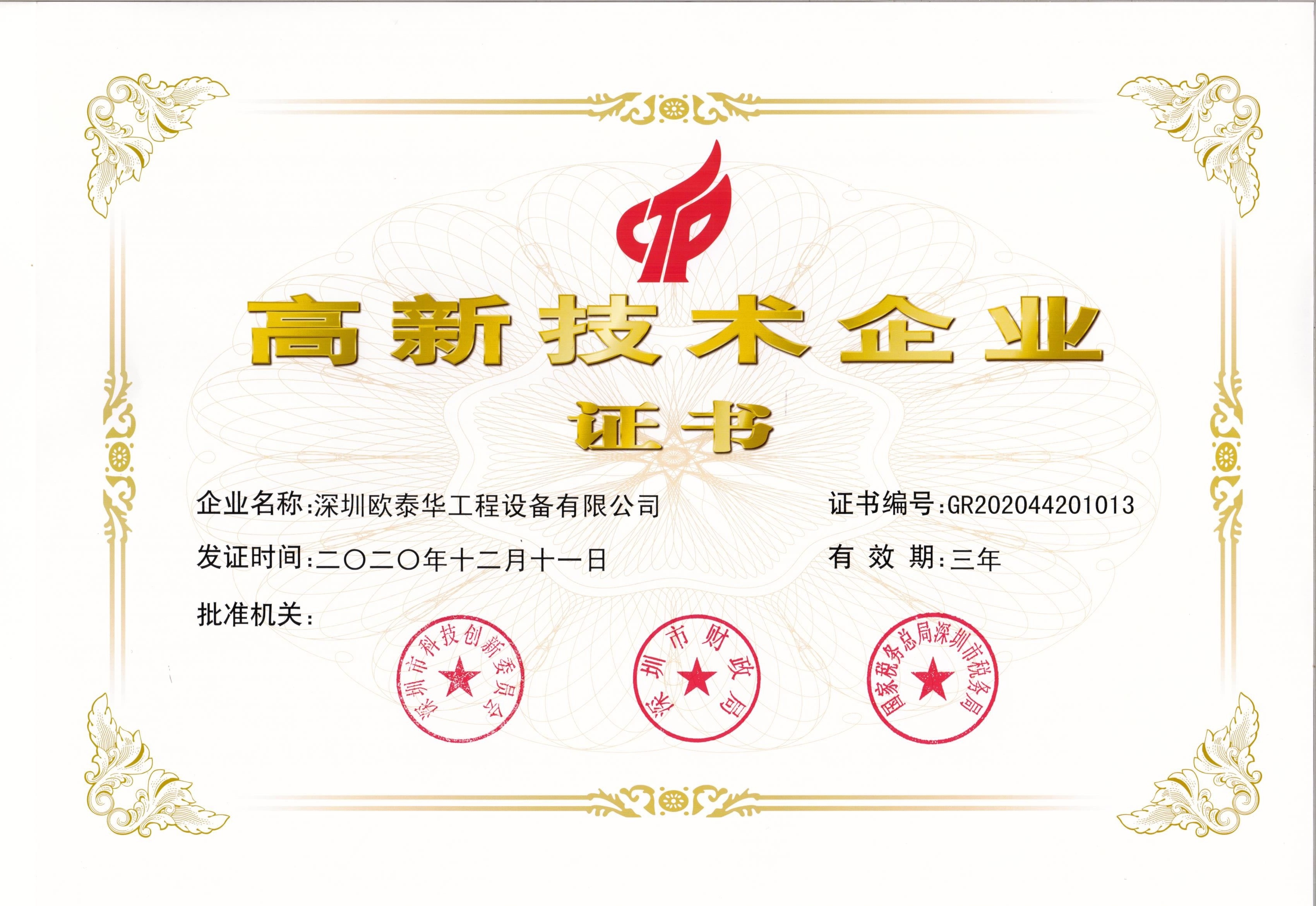 近日,公司收到深圳市科技創新委員會、深圳市財政局、深圳市稅務局聯合頒發的《高新技術企業證書》。深圳歐泰華工程設備有限公司憑借不斷增強的自主創新能力、完善的服務運行機制、穩健的成長狀況以及良好的市場發展前景,已經連續第三次認定為“高新技術企業”稱號。