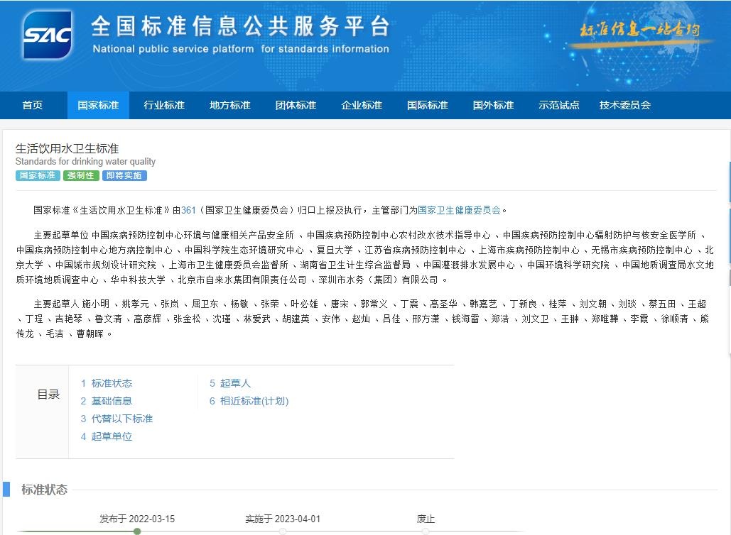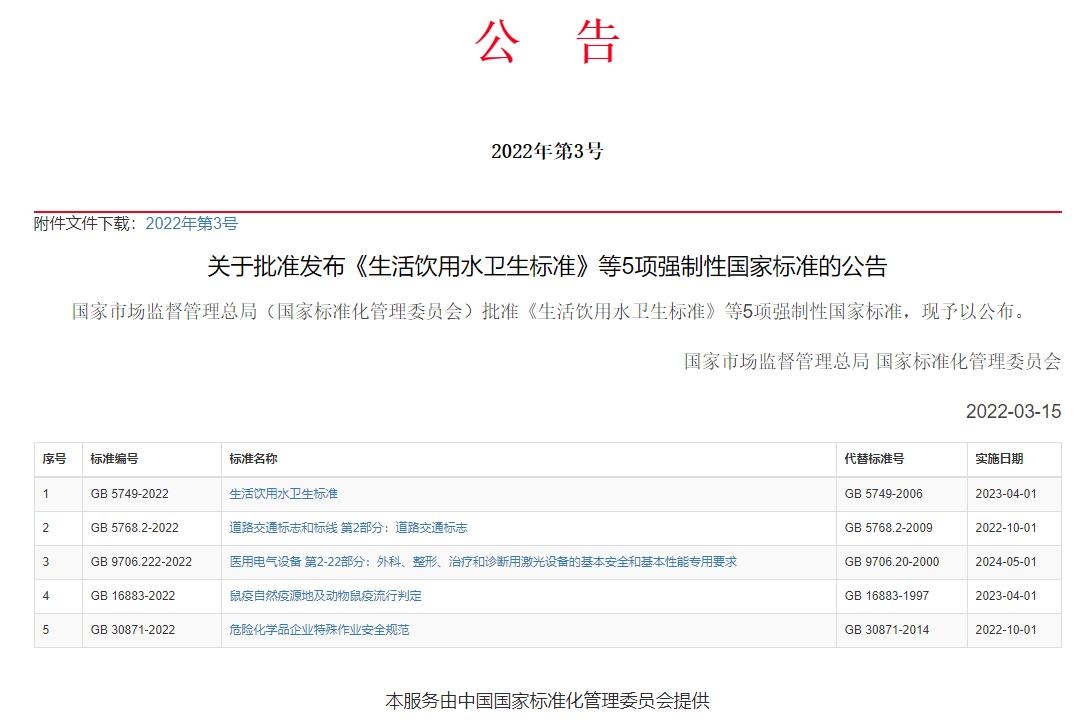 2022年3月15日,國(guó)家市場(chǎng)監(jiān)督管理總局和國(guó)家標(biāo)準(zhǔn)化管理委員會(huì)聯(lián)合發(fā)布中華人民共和國(guó)國(guó)家標(biāo)準(zhǔn)公告(2022年第3號(hào))“關(guān)于批準(zhǔn)發(fā)布《生活飲用水衛(wèi)生標(biāo)準(zhǔn)等5項(xiàng)強(qiáng)制性國(guó)家標(biāo)準(zhǔn)的公告》”,正式批準(zhǔn)《生活飲用水衛(wèi)生標(biāo)準(zhǔn)》等5項(xiàng)強(qiáng)制性國(guó)家標(biāo)準(zhǔn)。