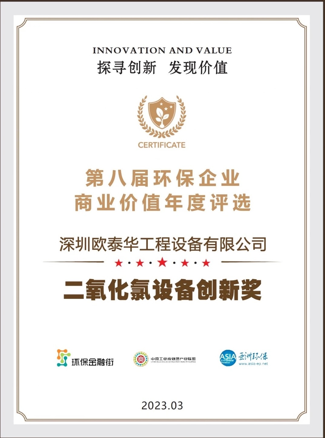 歐泰華榮獲環(huán)保企業(yè)商業(yè)價值年度評選——“二氧化氯設備創(chuàng)新獎”