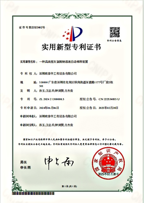 深圳歐泰華最新研發(fā)的"高濃度次氯酸鈉溶液自動(dòng)稀釋裝置"斬獲國家專利,三大核心技術(shù)破解行業(yè)痛點(diǎn):