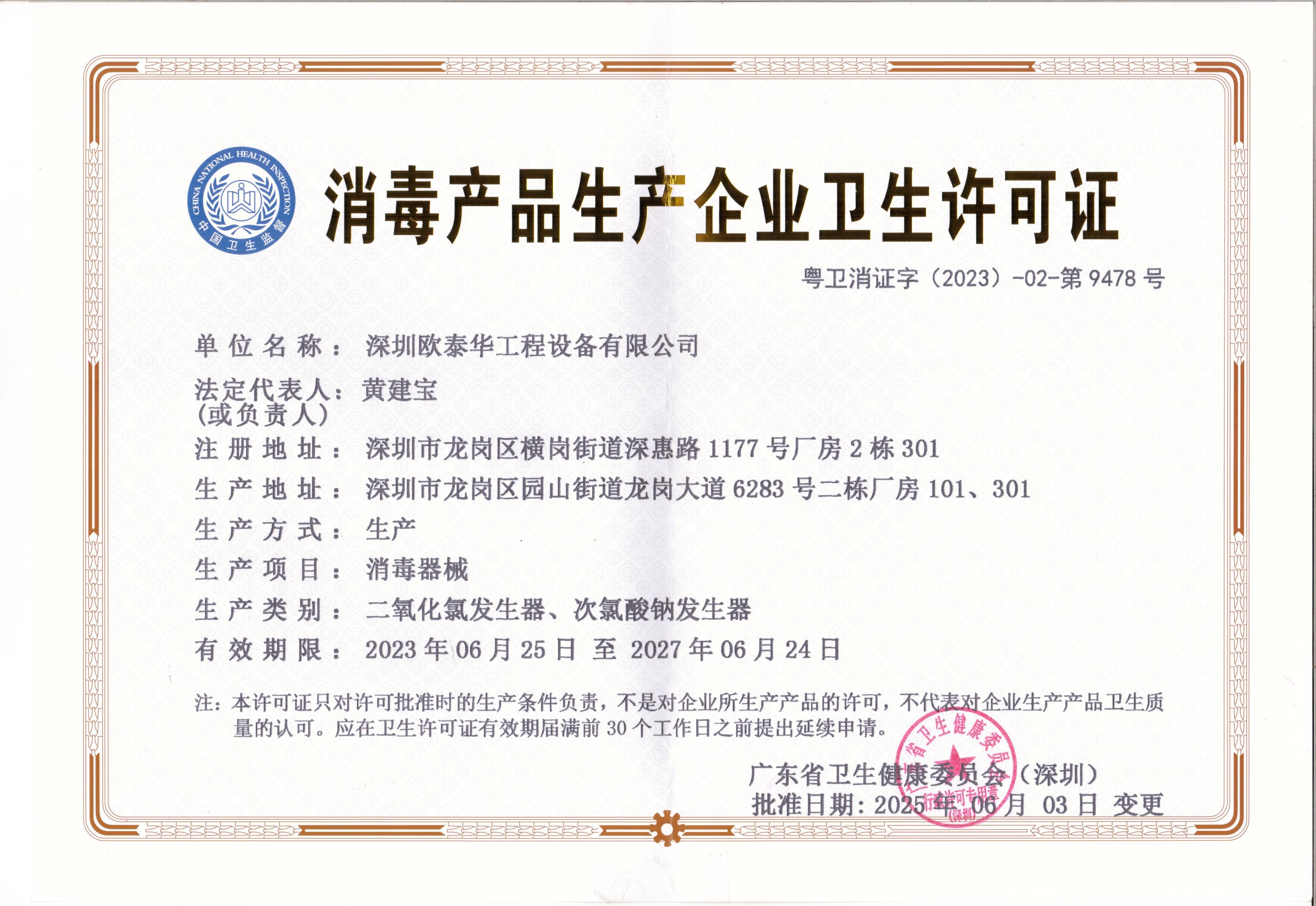 陽光好消息!歐泰華公司消毒產品生產企業衛生許可證已新鮮出爐!我們完成了證件的換發工作,原舊證同步作廢。這本嶄新的許可證是我們持續為您提供安全、可靠消毒產品的堅實承諾!