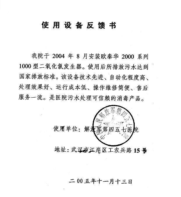 解放軍第四五七醫(yī)院-使用設(shè)備反饋書